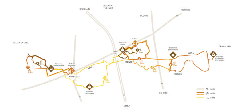 The Groupe d'Action Local Culturalité from Haspengouw in Walloon Brabant, together with a number of agricultural organisations, the Belgomalt malting plant and four local breweries, have mapped out five cycling and eight walking routes that introduce visitors to the world of barley, malt and beer. The 'Route du Malt' consists of several loop-shaped routes from 13 to 44 km, departing from Gembloers, Perwez and Ramillies and which can, if necessary, be combined into a fun day trip.